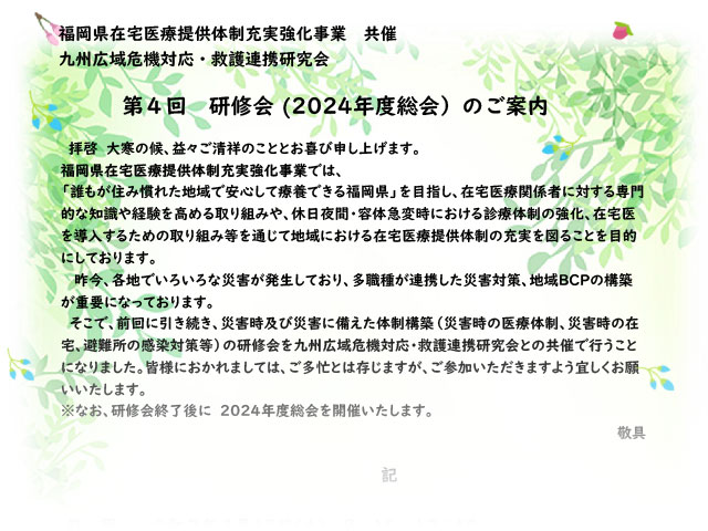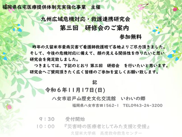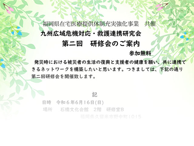 引き続き、来年度も研修会を開催致しますので、多くの方にご参加頂き、災害時の医療や支援、備え等について一緒に学んでいきたいと思います。また、本研究会にご入会頂き発災時に活動できる仲間を募っています。発災時の備えは、同じ地域に暮らす支援者のネットワークが必要であり急務の課題です。私たちは、九州広域に助け合いの支援者ネットワークを広げていきたいと思います。