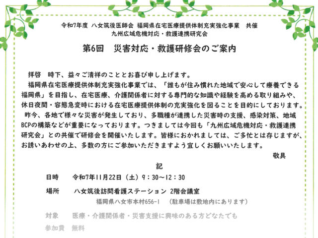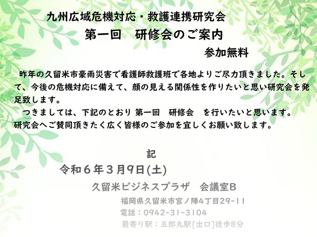 引き続き、来年度も研修会を開催致しますので、多くの方にご参加頂き、災害時の医療や支援、備え等について一緒に学んでいきたいと思います。また、本研究会にご入会頂き発災時に活動できる仲間を募っています。発災時の備えは、同じ地域に暮らす支援者のネットワークが必要であり急務の課題です。私たちは、九州広域に助け合いの支援者ネットワークを広げていきたいと思います。