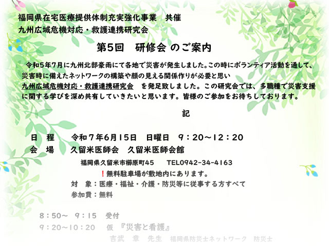 令和7年6月15日(日曜日)に久留米医師会館にて第5回研修会を行いました。梅雨時期の曇り空であいにくの天気の中、遠方からのご参加が多く、26名の方々にお集まり頂きました。今回の研修会では、福岡県防災士ネットワーク副代表の防災士 吉武章先生より「災害と看護」についてお話頂きました。吉武先生は、これまで全国各地の災害時に被災者支援、ボランティア活動をされておられます。