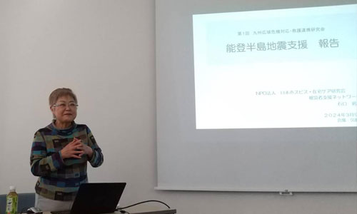 第3回研修会を八女市岩戸山歴史文化交流館にて開催しました。研修会に先立ち、今なお能登半島地震被災地支援が続く中、福岡市のNPO法人緩和ケア支援センターコミュニティ代表の平野頼子氏より現状のご報告と支援のご協力についてお話を頂きました。研修会終了後に、ご参加の皆様より合計44,100円の寄付金を頂き厚く御礼申し上げます。